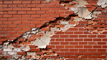 一张灰白色调的砖墙素材,砖块排列整齐,部分砖块呈现深灰色,墙面上有大面积剥落的灰白色涂料,露出底下的砖块,剥落的边缘不规则,带有自然的磨损痕迹,墙面整体质感粗糙,有细微的划痕和污渍,光线均匀,无明显阴影,适合作为墙素材使用,无任何多余场景元素。