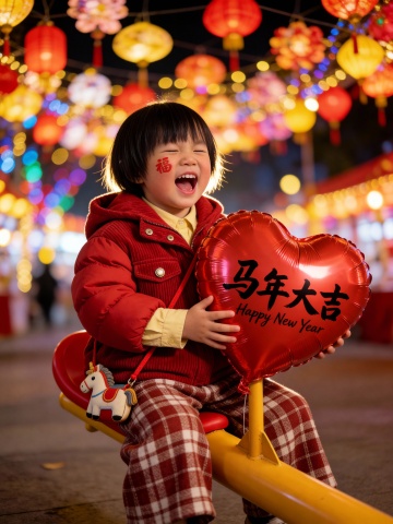 国潮风实景夜景,红衣童子手持“马年大吉”充气心形气球,笑靥如花,喜庆感十足,灯笼辉映,年味浓烈。