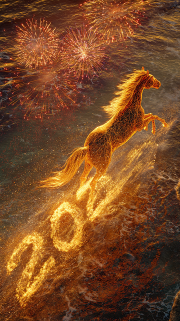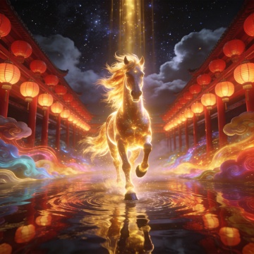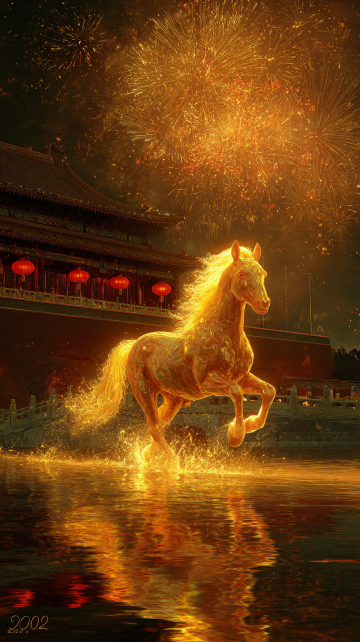 宏图2026·紫禁城角楼版 适用场景:官方、大气、国潮风。 主体:一匹通体发光的黄金神马,位于画面中心,正朝着镜头方向奔跑。马身呈半透明的琥珀质感,肌肉线条清晰可见。 材质与光效:马身散发着炽热的金色光芒,马蹄踏在水面上,溅起液态黄金般的水花,水花在空中化为光点。马鬃和马尾如同流动的火焰,随风向后剧烈飘动,发丝边缘带有明亮的辉光。 背景:背景替换为故宫紫禁城角楼的夜景剪影,城墙上传统的红灯笼连成一