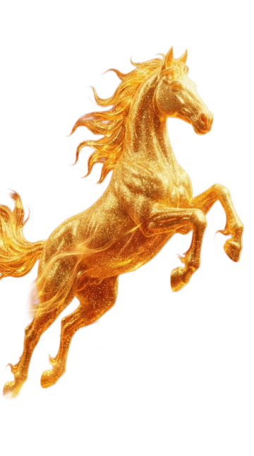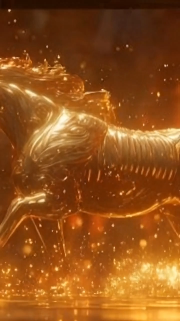同样一匹马,一匹通体发光的黄金神马,位于画面中心,正朝着镜头方向奔跑。马身呈半透明的琥珀质感,肌肉线条清晰可见。 材质与光效:马身散发着炽热的金色光芒,马蹄踏在水面上,溅起液态黄金般的水花,水花在空中化为光点。马鬃和马尾如同流动的火焰,随风向后剧烈飘动,发丝边缘带有明亮的辉光。 背景:两侧的立柱化身为巨大的、燃烧着红色火焰的凤凰羽翼剪影,羽翼中间悬挂着红灯笼,形成一种神圣的通道感。 新增烟花特效: