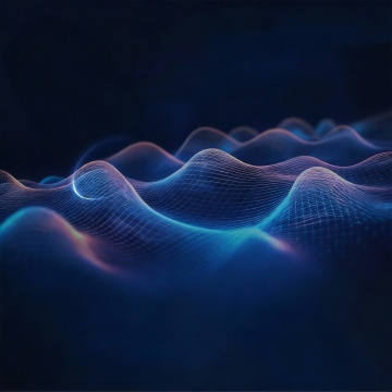 深蓝色渐变背景,底部由发光的蓝色粒子和光线构成波浪状网格结构,网格上点缀着大小不一、亮度各异的蓝色光点,光线从网格底部向上散发,形成明亮的光带,整体呈现出强烈的科技感和未来感,画面宁静而富有动感,营造出深邃、神秘的数字空间氛围。