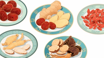 六个规整排布的中药主题插画系列素材集合,每个元素均采用复古手绘线稿风格,搭配温暖的棕色、赭石色和橄榄绿为主色调,细节处有细腻的纹理和阴影表现。包含:1. 左侧:一本翻开的古籍书页上放置着几株完整的人参,书页旁散落着几颗饱满的枸杞,背景有缠绕的麻绳;2. 右上:一个深色陶罐中插着干燥的艾草束,罐身贴有空白标签,旁边点缀着几片艾叶;3. 右下:一个带木塞的玻璃瓶内装着切片的黄芪,瓶口露出几片黄芪饮片,下方散落着三两片甘草叶;4. 左上:一卷用麻绳捆绑的肉桂棒,旁边摆放着几颗完整的桂圆,背景有细小的肉桂粉末;5. 中间:一个竹制药杵旁放置着研钵,里面是捣碎的当归,旁边散落着当归切片和几根当归须;6. 左下:一个陶瓷药罐中插着几支金银花,罐口缠绕着藤蔓,下方有几颗散落的金银花蕾。所有元素均以纯色背景呈现,保持统一的复古手绘质感和中药类目主题,整体构图平衡,信息传达清晰,具有浓厚的传统医药文化氛围。