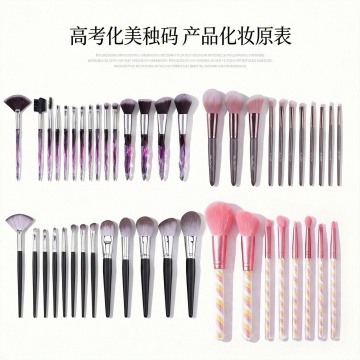 极简高端美妆产品集合海报,六个完全不同的美妆元素规整排布于纯白色纯色背景上,保持高清写实摄影风格,光线明亮柔和,物体表面有细腻高光与轻微阴影,展现透明玻璃与精致塑料的质感。元素包括:左上角为方形透明玻璃面霜瓶配银色金属盖,标签简约;右上角是圆柱形白色乳液瓶带按压泵头;中间左侧为长方体磨砂玻璃精华液瓶;中间右侧是黑色皮质化妆包带金色拉链;左下角为三支不同尺寸的化妆刷套装,刷毛柔软呈浅棕色;右下角为圆形透明唇釉管体。所有物体间距均匀,构图对称平衡,整体传达优雅、高端、专业的美妆产品氛围,无任何文字、LOGO、二维码及多余信息。