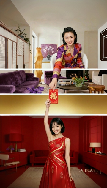 黑旗袍工笔绣花,红墙映衬,中式复古优雅,国潮风韵十足。