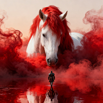 赛博朋克风都市夜景中,一匹白骏马伫立于霓虹光影下,厚涂技法融合油画质感,未来感与科技感交织,虚拟现实意境扑面而来。