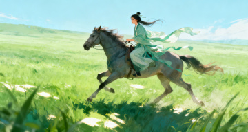 梦幻光影中,古典仕女与鎏金白马共舞,工笔细腻,水彩晕染,唯美感与优雅感交织,中式意境如诗如画。