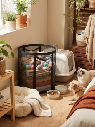 超写实风格白色滚筒洗衣机,银色金属质感圆形舱门,控制面板带旋钮和小型显示屏,顶部放置透明玻璃杯、米色按压瓶和棕色小瓶,左侧为装满白色毛巾的编织篮,旁边有绿色植物。柔和自然光从右侧照射,高光与阴影对比清晰,物体表面光滑反光。背景改为简洁的浅灰色水泥墙面,搭配木质搁板和白色收纳柜,地面为光滑白色瓷砖,整体营造现代简约、干净整洁的家居氛围。