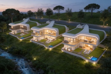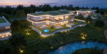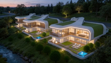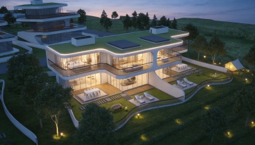 现代风格别墅,位于缓坡之上,整体呈现白色与木质棕色搭配的外立面,大面积落地玻璃窗,内部灯火通明,悬挑式露台设计,周围环绕修剪整齐的绿色草坪、低矮灌木、石阶小径,背景是傍晚时分的淡蓝色天空,远处有模糊的山脉轮廓,光线柔和,营造出宁静而高端的居住氛围。