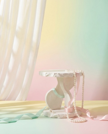 极简主义风格3D渲染,柔和自然光从左上角斜射,在浅米色哑光背景墙上投下清晰的植物阴影,白色弧形展示台上放置不同内容的装饰元素,配色采用清新的马卡龙色系,场景为简约现代的家居展示空间,整体氛围宁静舒适,光线柔和,阴影过渡自然,具有高度的画面整洁度和设计感。