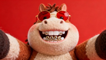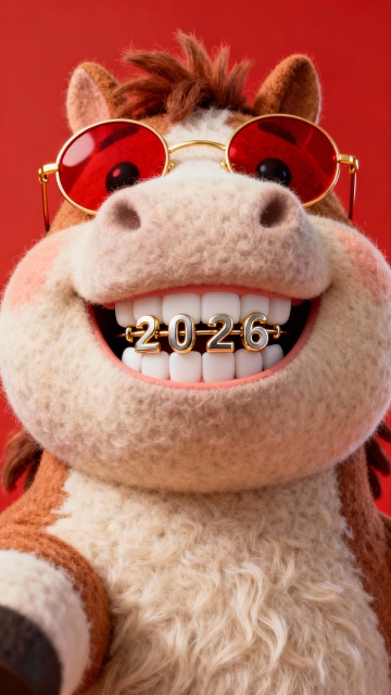 软3D风格的拟人化小马,戴红色墨镜,笑容灿烂,牙齿上镶嵌“2026”字样,毛发生长细节丰富,充满卡通感与喜庆氛围,寓意新年祝福。