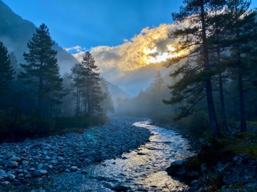 晨雾缭绕的山谷溪流,光影交错间透出静谧与清透,胶片质感捕捉自然风韵,唯美感与文艺气息交织,宛如水墨画境。