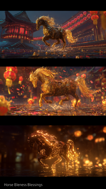 一匹金色的骏马,全身散发着光芒,鬃毛飞扬,马蹄踏在水面上,东方神话风格。 环境: 两侧是红色的灯笼长廊,背景是夜晚的星空,地面是倒影水面,周围有彩色的流动祥云和能量波纹。 光影与质感: 电影级布光,强烈的体积光,金色与红色的对比,8k分辨率,虚幻引擎5渲染风格,梦幻,神圣感,高细节。 构图: 正面视角,对称构图,广角镜头。