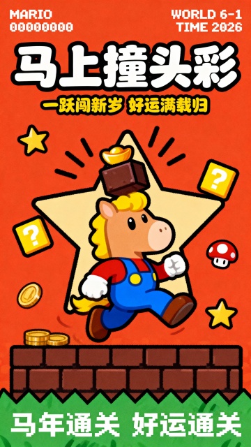 卡通马里奥拟人化跃起撞砖,融合波普艺术与粘土风3D角色设计,喜庆红底搭配问号箱、金币元素,插画风呈现新年趣味感,传递马年好运通关主题。