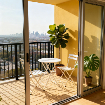 现代简约阳台,藤编家具搭配自然光影,营造舒适柔和的3D实景感,木雕风与面料质感交织,尽显清透宽阔的都市静谧。