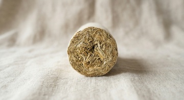 极简主义风格的艾灸主题静物摄影,柔和的米白色背景占据大面积留白,营造出宁静、洁净、禅意的氛围。画面左侧有一卷微微卷起的米白色宣纸,纸张边缘自然弯曲,展现出细腻的纸质纹理。宣纸前方偏左位置放置一根正在燃烧的艾条,艾条底部有黑色的燃烧灰烬,顶端可见红色的燃烧火星,火星周围呈现渐变的橙红色调,散发着温暖的微光。右侧水平横放着三根未燃烧的艾条,艾条呈圆柱形,表面为米白色并带有细小的深色纹理,顶部切面可见细密的艾绒纤维结构,三根艾条相互平行且略有交错,形成稳定的视觉平衡。整体构图遵循三分法,主体元素集中在画面下方,上方留有大量空白,光线为柔和的顶侧光,阴影浅淡自然,色彩以统一的米白色和艾条的自然本色为主,整体画面简洁、雅致,信息传达清晰,突出艾灸的自然、传统与疗愈感,具有极高的设计感和视觉舒适度。