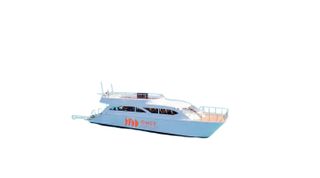 一艘造型流畅的豪华游艇在碧蓝的海面上高速行驶,船身线条经过重新设计,呈现出更具未来感的流线型轮廓,白色的上层建筑搭配深蓝色的船体,在明亮的阳光下闪耀着金属般的光泽,船尾激起巨大的白色浪花,形成优美的尾迹,甲板上有几个人正在享受航行的乐趣,远处是连绵的山脉和海岸线,天空晴朗无云,整体画面呈现出高端、奢华、动感的氛围,具有极高的摄影写实度,光影效果自然,海水的质感清澈透明,波光粼粼。