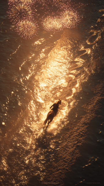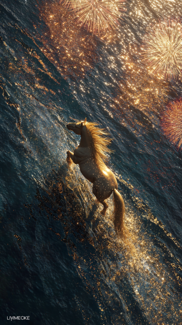宏图2026·紫禁城角楼版 适用场景:官方、大气、国潮风。 主体:一匹通体发光的黄金神马,位于画面中心,正朝着镜头方向奔跑。马身呈半透明的琥珀质感,肌肉线条清晰可见。 材质与光效:马身散发着炽热的金色光芒,马蹄踏在水面上,溅起液态黄金般的水花,水花在空中化为光点。马鬃和马尾如同流动的火焰,随风向后剧烈飘动,发丝边缘带有明亮的辉光。 背景:背景替换为故宫紫禁城角楼的夜景剪影,城墙上传统的红灯笼连成一