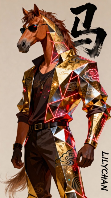 未来感与中式元素融合,拟人化马头角色身披low poly风格金属铠甲,霓虹灯勾勒线条,鎏金纹理与云纹刺绣交织,展现科技与传统碰撞的酷炫奢华。