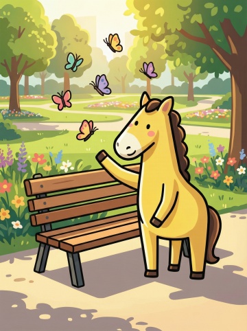马年复古卡通插画风,拟人化马娘优雅享冰激凌,温馨甜蜜氛围,描边与水彩融合,春节“骡马”假日街景,牛马放假啦~~