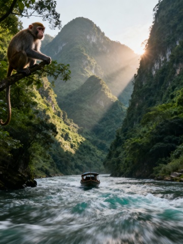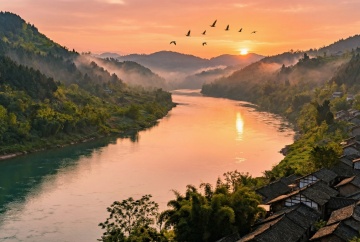 背景是层峦叠嶂的青绿色山脉,山间薄雾缭绕,远处田野呈现柔和的色块,阳光透过枝叶洒下斑驳的光影,整体色调温暖清新,画面充满丰收的治愈感