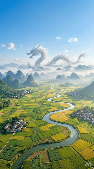 背景是层峦叠嶂的青绿色山脉,山间薄雾缭绕,远处田野呈现柔和的色块,阳光透过枝叶洒下斑驳的光影,整体色调温暖清新,画面充满丰收的治愈感