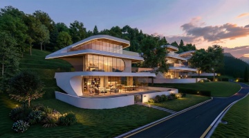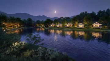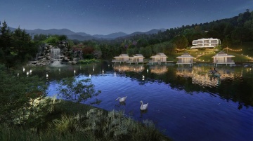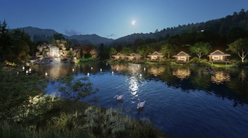 一个位于松林内的温泉泡池,泡池的外轮廓结合从龙爪的元素抽象化设计,泡池相连一个休闲平台,平台上放置有两把休闲躺椅,泡池的压顶齐平平台,泡池周边是自然的石头结合低矮的灌木,平台是龙鳞样式的压纹。温泉的进水口由烛龙元素与大块的石头结合而成,温泉水从进水口流入泡池内,温泉水从烛龙的烛台流入泡池内。烛龙是人面龙身拿着烛台的形象。泡池内禁止溢水出去,平台外是丰富的植物绿化:大乔木、小乔木以及灌木,且局部点缀