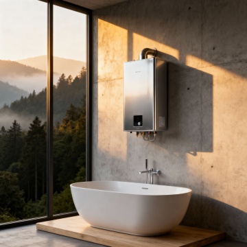 3D渲染风格浴室场景,主色调为纯净的白色与温暖的米色,搭配金色水龙头点缀,柔和的自然光从巨大的落地窗洒入,窗外是壮丽的雪山远景,光线在光滑的地面形成明亮的反光与柔和的阴影。画面中央是一个现代简约风格的白色浴缸,边缘搭着一条白色毛巾,金色水龙头正流出清澈的水。浴缸后方的米色立柱上安装着白色的热水器,下方壁龛内整齐摆放着折叠的白色毛巾和透明瓶身的洗护用品。整体氛围宁静、高端、充满自然光线与开阔视野,展现出极简主义的优雅与舒适。