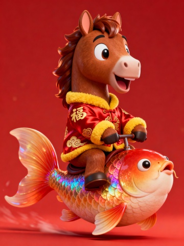 软3D风拟人马穿国潮红袍骑锦鲤,喜庆卡通感十足,粒子光效点缀,尽显春节吉祥氛围。