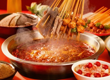 重拟物风呈现热辣沸腾的中式火锅,油光溢彩,蒸汽缭绕,辣椒与牛肚在光影中跃动,质朴木桌衬托实景感,如油画般浓郁。