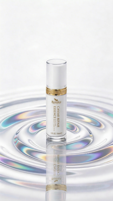 一支淡绿色护肤软管(#B5E0D3)立于晶莹水滴之上,水滴下方是天然石块底座,悬浮在浅青绿色背景(#E0F2F1)中,背景有模糊的白色与淡粉花朵,柔焦散景,光线从左上方斜射,形成清晰倒影与光束,极简美学,清新自然,高级摄影风格,3:4竖版构图