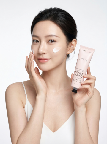 一张年轻女性手持护肤品、渐变紫色背景的美妆广告风格图片