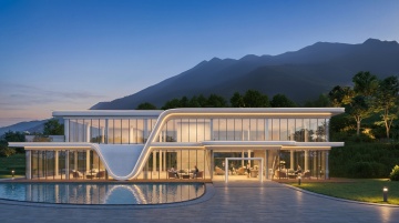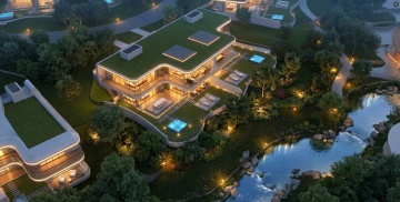 一个位于松林内的温泉泡池,泡池的外轮廓结合从龙爪的元素抽象化设计,泡池相连一个休闲平台,平台上放置有两把休闲躺椅,泡池的压顶齐平平台,泡池周边是自然的石头结合低矮的灌木,平台是龙鳞样式的压纹。温泉的进水口由烛龙元素与大块的石头结合而成,温泉水从进水口流入泡池内,温泉水从烛龙的烛台流入泡池内。烛龙是人面龙身拿着烛台的形象。泡池内禁止溢水出去,平台外是丰富的植物绿化:大乔木、小乔木以及灌木,且局部点缀