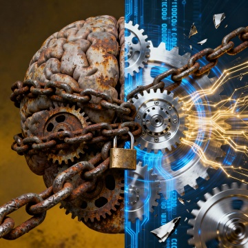 一个由蓝色发光线条和粒子构成的抽象人形侧面轮廓,头部向后仰,面部特征模糊,身体由流动的光线和数字粒子组成,呈现出科技感和未来感,线条从头部向后延伸并逐渐扩散,形成动感的光效,背景为深邃的深蓝色,整体画面充满神秘感和科技氛围,光线明亮且具有流动感,粒子细节丰富,色彩以蓝色为主,点缀少量白色和黄色光点,营造出梦幻而先进的视觉效果。