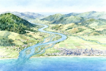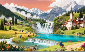 清新水彩插画风,蓝天绿地映衬河流,自然和谐,充满生机。