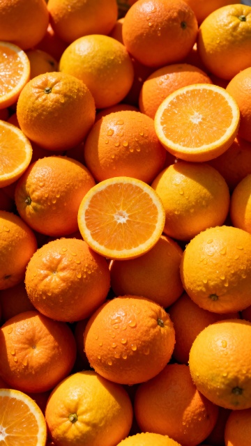 超写实摄影风格,大量新鲜橙子组成的背景,特写镜头,包含完整的圆形橙子和对半切开的橙子剖面,剖面露出清晰可见的橙瓣纹理与白色脉络,橙色果皮光滑带有自然光泽,部分切开的橙子上点缀着一片绿色的橙子叶,整体色彩以明亮饱满的橙黄色为主,光线从上方均匀照射,形成柔和的高光与自然阴影,突出橙子的水润质感和立体感,构图紧密充实,无留白,展现橙子的新鲜与活力。