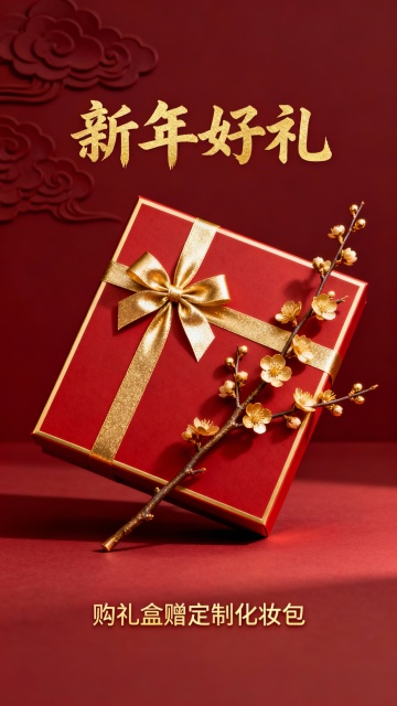 国潮风礼盒,鎏金浮雕梅花点缀,重拟物设计呈现中式奢华,喜庆红金配色尽显新年氛围。