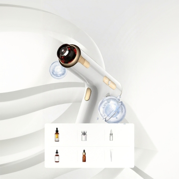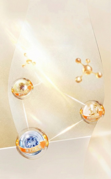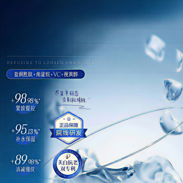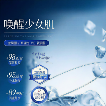 美妆产品宣传海报,整体采用清新通透的蓝白渐变色调,柔和的顶部光源营造出水润光泽感,3D立体展示的白色软管状护肤品置于圆形白色平台上,周围点缀白色花朵和绿色叶片,画面上方有产品核心功效的蓝色圆形图标与文字说明,中部包含分点介绍的肌肤问题示意图与解决方案,下方通过水滴、透明气泡等元素展现产品水润质地,搭配清晰易读的无衬线字体,整体排版层次分明,信息传达高效,符合护肤品针对敏感肌、追求温和清洁与保湿人群的宣传目的,保持相同设计风格与视觉元素,替换展示不同护肤品。