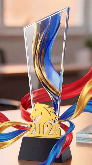 一个透明水晶材质的奖杯,主体呈流线型向上收窄的几何形态,顶部镶嵌着一颗立体的金色五角星,底座为双层圆形金色金属结构,整体呈现出光滑的表面质感和清晰的棱角,高光部分明亮,阴影过渡自然,置于纯白色的纯色背景上。