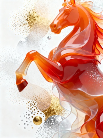 未来感与科技感交融的3D玻璃马,流光溢彩的液态鬃毛如梦幻般飘逸,清透质感中点缀金银粒子,优雅呈现虚拟现实之美。