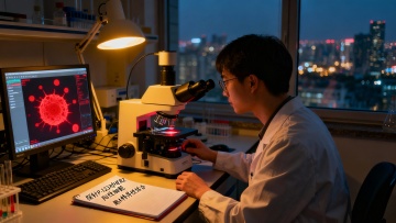 一个干净规整的现代化实验室场景,采用写实风格,以蓝白色调为主,光线明亮柔和,具有清晰的光影层次和细腻的质感表现。画面中可见身着白色防护服的研究人员在先进的白色和蓝色精密仪器设备旁工作,背景是带有规则几何图案的白色墙面。构图采用三分法,空间感强,整体氛围专业、严谨、科技感十足,适合作为背景使用。