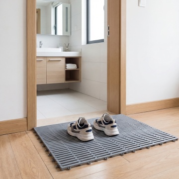 现代极简风格的客厅场景,以浅灰色调为主的现代家具布置,画面聚焦于铺在浅灰色瓷砖地面上的浅灰色条纹地毯特写,地毯表面有细腻的竖条纹纹理和柔软的编织质感,占据画面下方大部分区域;背景中可见浅灰色布艺沙发,搭配几个同色系的靠垫,沙发旁有一个圆形金属边框的小茶几,靠墙处有一个简约的灰色搁板,上面放置一个小型装饰画框;右侧是大面积的落地窗,透过轻薄的白色纱帘洒入明亮柔和的自然光,光线在地毯和地面上形成自然的光影过渡,窗外可见模糊的绿色植物,整体营造出宁静、整洁、高级的现代家居氛围,空间感开阔,线条简洁,色彩统一和谐,具有清晰的视觉层次和舒适的居住感。