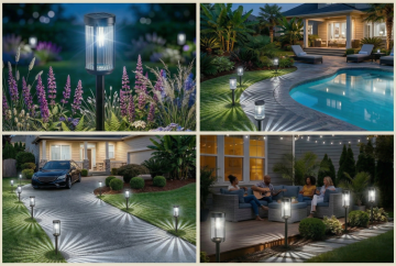 3D风与重拟物结合,金属质感灯饰在夜色中投射柔和光影,营造静谧现代庭院氛围,实景感十足,极繁主义细节尽显舒适与优雅。
