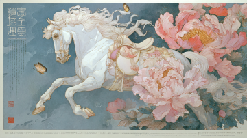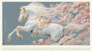 水墨风与工笔风交融,拟人化的可爱白马跃动于山水间,粉色鬃毛飘逸,尽显中式梦幻与卡通趣味。