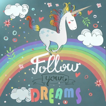 卡通风格的独角兽,彩虹鬃毛与彩色糖果环绕,蜡笔质感搭配拼贴元素,充满童趣与甜蜜感,波普艺术风格点缀节日欢愉氛围。