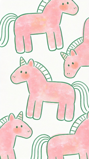 灵魂画手,简笔手绘线稿,绘本简约,绿色色线勾勒,有食欲,抽象,艺术,高级,大写意,极简风格,几只卡通可爱小马,矢量弥散,完美线条,粉色为主色调,磨砂肌理,朦胧感,非写实,色彩饱满,笔触细腻,手稿,大师杰作,白色背景
