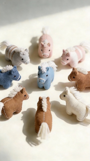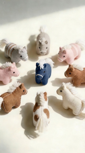 六个不同配色、不同样式的卡通布艺风格小马造型,每个小马都具有圆润可爱的身体、大大的眼睛、微笑的嘴巴和明显的缝线细节,整体呈现出柔软的毛绒玩具质感,上下两行整齐排列在浅色背景上。