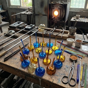 六个不同配色、不同样式、不同材质的精华产品,整体呈现出透明玻璃质感的球体造型,内部含有不同形态的金色或彩色液体与精华成分,每个球体大小不一,表面光滑且带有细腻的光泽感,光线从上方照射,在球体表面形成明亮的高光和柔和的阴影,所有精华整齐排列在纯白色背景上,构图简洁,视觉层次分明,突出产品的高端质感和纯净感。