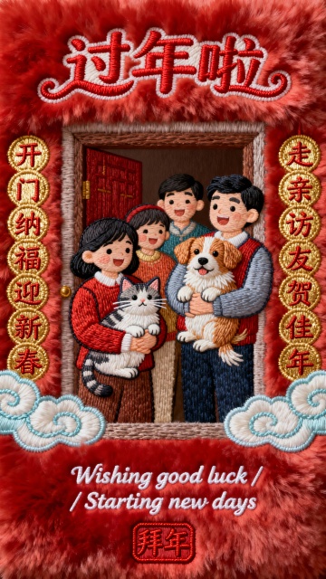 软3D毛绒质感融合刺绣风,卡通人物与传统元素交织,国潮风格呈现喜庆归宁主题,浮雕式文字搭配毛发生长细节,传递温馨团圆氛围。