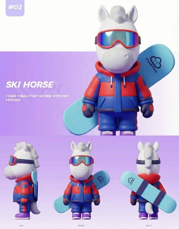 软3D风拟人马仔,卡通感十足,穿滑雪服戴护目镜,手持雪板,萌趣可爱,节日氛围浓厚。
