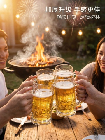 温暖的夏日傍晚,一群人手握装满金黄色啤酒的玻璃杯,杯中啤酒泡沫细腻丰富,杯壁上凝结着晶莹的水珠,众人高举酒杯相互碰撞,庆祝的瞬间充满欢乐与活力。背景中悬挂着密密麻麻的暖黄色串灯,灯光朦胧柔和,营造出温馨浪漫的氛围,周围树木的枝叶在微风中轻轻摇曳,光影斑驳交错,整体画面色彩变换为以深蓝、紫色和粉色为主的梦幻色调,保留原有的聚会欢庆场景和所有元素细节,光影效果依旧柔和朦胧,充满节日的热闹与温馨感。